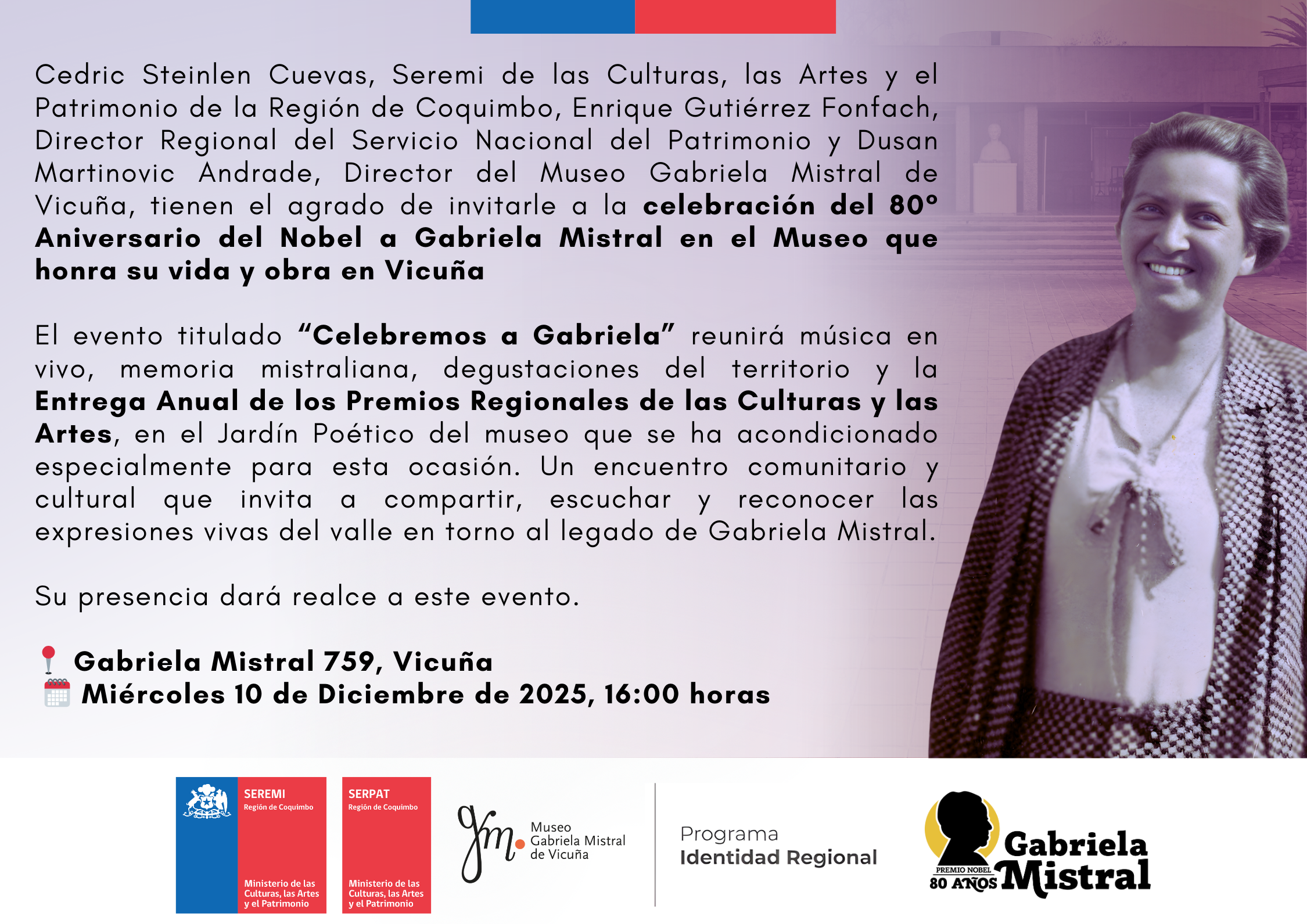 Museo Gabriela Mistral de Vicuña invita a participar en “Celebremos a Gabriela”, una jornada abierta que forma parte del programa conmemorativo por los 80 años del Premio Nobel de Literatura otorgado a la autora en 1945. La actividad se desarrollará en el Jardín Poético del museo, espacio preparado especialmente para reunir expresiones artísticas, memoria mistraliana y participación comunitaria.