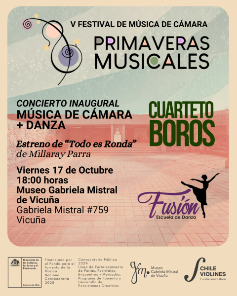 Este viernes 17 de octubre, a las 18:00 horas, Museo Gabriela Mistral de Vicuña será escenario del concierto inaugural del V Festival de Música de Cámara Primaveras Musicales, con la presentación del Cuarteto Boros y el estreno de “Todo es Ronda”, obra de la compositora Millaray Parra inspirada en el universo poético de Gabriela Mistral. Como todas las actividades del museo, el concierto es de acceso liberado, con ingreso por la entrada principal del museo, ubicado en Gabriela Mistral 759, pleno centro de la ciudad elquina.