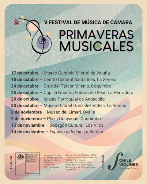 Organizado por Fundación Chile Violines, el festival cuenta con financiamiento del Fondo para el Fomento de la Música Nacional (Convocatoria 2025) y del Programa de Fomento y Desarrollo de Ecosistemas Creativos (Convocatoria 2024) del Ministerio de las Culturas, las Artes y el Patrimonio. En su quinta edición, el encuentro amplía su alcance territorial y artístico, integrando la música de cámara con la danza, la fotografía y las artes visuales en un recorrido por distintos espacios culturales de la Región de Coquimbo.