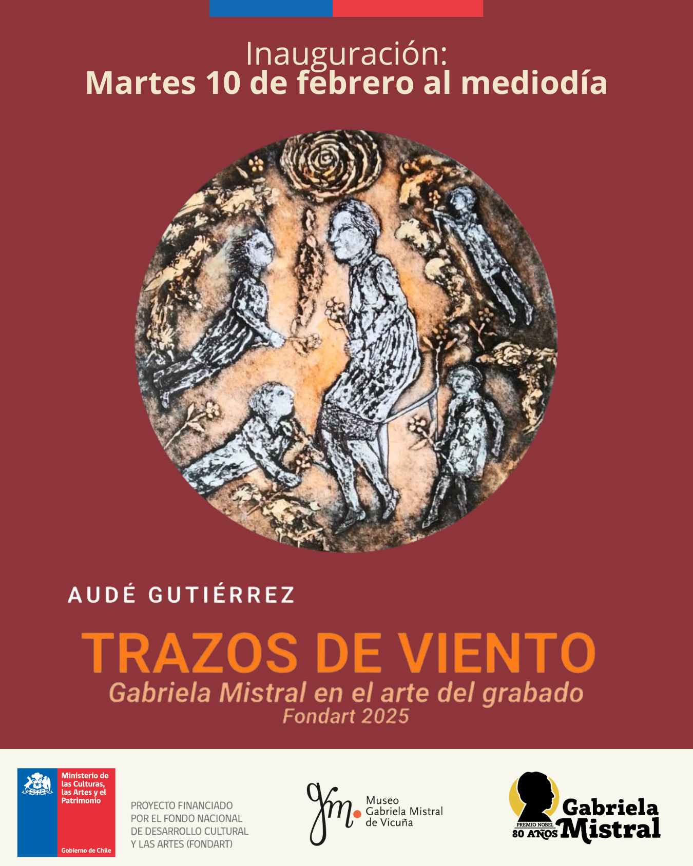 Museo Gabriela Mistral de Vicuña, unidad del Servicio Nacional del Patrimonio Cultural, inaugurará el martes 10 de febrero, a las 12:00 horas, la exposición “Trazos de viento. Gabriela Mistral en el arte del grabado”, del artista visual Audé Gutiérrez, relevante exponente del grabado contemporáneo en la Región de Coquimbo.