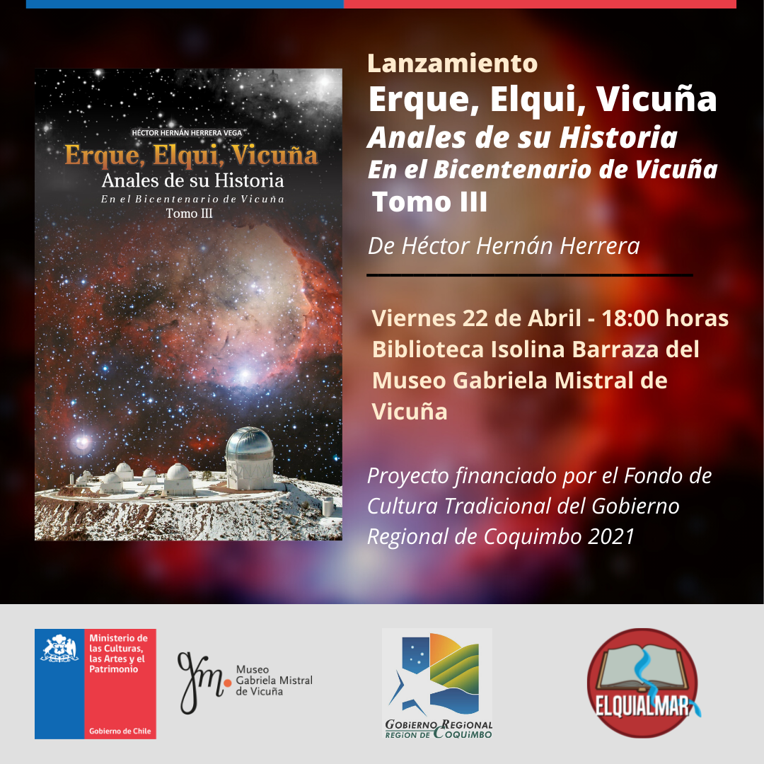 El viernes 22 de abril, a partir de las 18:00 horas, el autor elquino Héctor Hernán Herrera Vega, junto al Centro Cultural y Artístico Elquialmar de Vicuña, uno de los más longevos al norte de la capital, lanzan en el Museo de Vicuña el libro "Erque, Elqui, Vicuña. Anales de su Historia. En el Bicentenario de Vicuña. Tomo III". Un volumen producido en medio de la pandemia del COVID-19, días en los que además se celebró el Bicentenario de Vicuña.