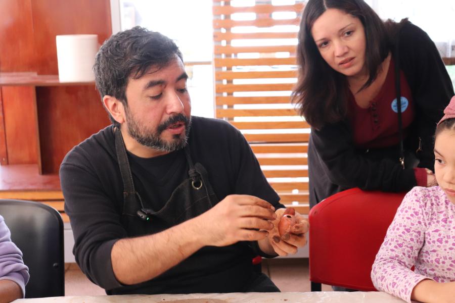 A continuación, a las 11:30, se llevó a cabo un Taller de Alfarería Sonora en la terraza del museo. Este taller, guiado por Camilo Muñoz de la iniciativa cultural Sueño de Pájaro, combinó la artesanía y la música, reuniendo a niñas y niños, madres y padres, en torno a los saberes ancestrales.