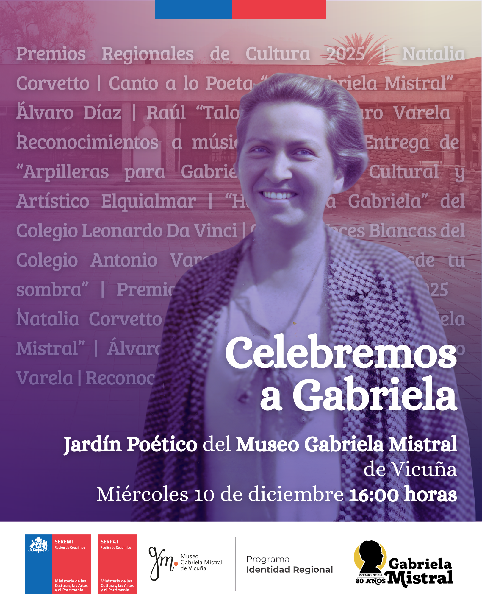 A partir de las 16:00 horas, el Jardín Poético, pulmón verde del museo, será el escenario de "Celebremos a Gabriela", un encuentro cultural y comunitario con presentaciones artísticas, intervenciones audiovisuales y degustaciones tradicionales. La tarde comenzará con la exhibición del cortometraje “Desde tu sombra”, del realizador ovallino Víctor Soto Castillo, para luego dar paso a la presentación del Coro de Voces Blancas del Liceo Bicentenario de Excelencia Colegio Antonio Varas de Vicuña. En ese mismo bloque se realizará la entrega de reconocimientos a las y los músicos que participaron en el "Concierto Andino 80 años Nobel Gabriela Mistral” en Coquimbo.