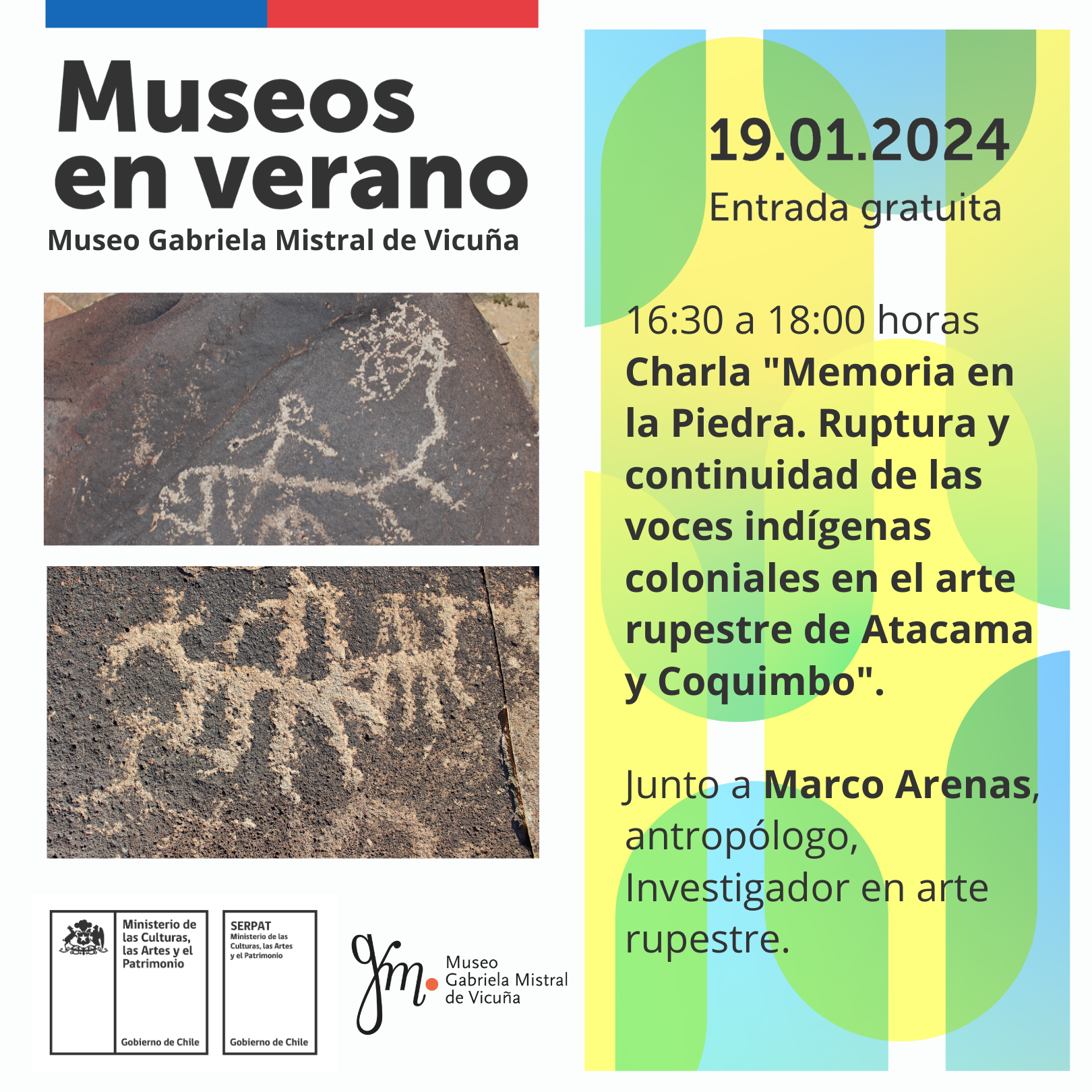 La jornada concluirá con la charla "Memoria en la Piedra. Ruptura y continuidad de las voces indígenas coloniales en el arte rupestre de Atacama y Coquimbo", entregada por el antropólogo Marco Arenas, de 16:30 a 18:00 horas. Arenas es un renombrado investigador formado en la Universidad Academia de Humanismo Cristiano, especializado en Arte Rupestre Colonial. Su carrera se ha caracterizado por una profunda exploración de las manifestaciones artísticas y culturales indígenas, evidenciada en sus numerosos artículos y publicaciones. Coautor de obras como "El Oro de Chile" y "De Marga Marga a Colliguay" junto a Waldo Cuadra, su trabajo no solo ha contribuido significativamente al estudio del arte rupestre, sino también a la comprensión de la historia de la minería en Chile.