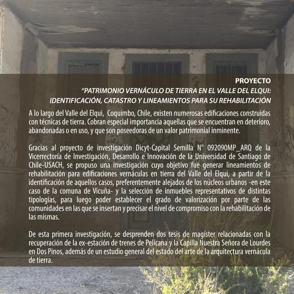 Gracias al proyecto de investigación Dicyt-Capital Semilla N° 092090MP_ARQ de la Vicerrectoría de Investigación, Desarrollo e Innovación de la Universidad de Santiago de Chile-USACH, se propuso una investigación cuyo objetivo fue generar lineamientos de rehabilitación para edificaciones vernáculas en tierra del Valle del Elqui, a partir de la identificación de aquellos casos, preferentemente alejados de los núcleos urbanos -en este caso de la comuna de Vicuña- y la selección de inmuebles representativos de distintas tipologías, para luego poder establecer el grado de valorización por parte de las comunidades en las que se insertan y precisar el nivel de compromiso con la rehabilitación de las mismas.