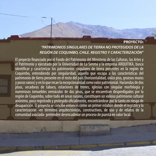 El proyecto financiado por el Fondo del Patrimonio del Ministerio de las Culturas, las Artes y el Patrimonio y ejecutado por la Universidad de La Serena y la empresa ARQUITIKA, busca identificar y caracterizar los patrimonios singulares de tierra presentes en la región de Coquimbo, entendiendo por singularidad, aquello que escapa a las características del patrimonio de tierra presente en el resto del país (horizontalidad, único piso, gruesos muros y pocos vanos) y en lo que recae la excepcionalidad como valor patrimonial. Haciendas de dos pisos, secadoras de tabaco, estaciones de trenes, iglesias con singular morfología y numerosos inmuebles vernáculos de dos pisos, que se encuentran desperdigados por la región de Coquimbo, sobre todo en áreas rurales, constituyen un valioso patrimonio cultural anónimo, poco registrado y protegido oficialmente, encontrándose por lo tanto en riesgo de desaparición. El proyecto se concibe entonces como un primer eslabón donde el registro y la caracterización -en términos arquitectónicos, constructivos, de uso y de relatos de la comunidad asociada- pretenden desencadenar un proceso de puesta en valor local.